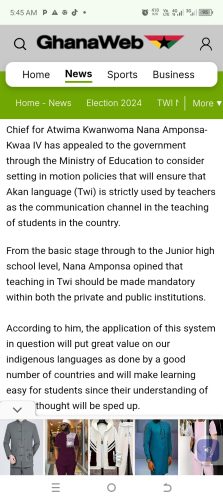 In a ghanaweb publication dated 13th May, 2018, Nana Amponsah Kwaa IV is captured appealing to government through the Ministry of Education to set in motion policies that will ensure a compulsory usage of the local language in the teaching of students.