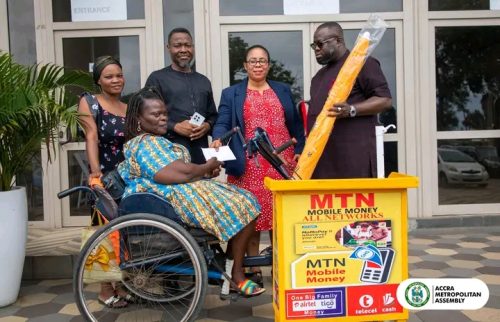 The Accra Metropolitan Assembly (AMA) has presented a set of MTN mobile money vending start-up tools and GH₵3,000 working capital to Ms. Hilda Doodo, a physically challenged woman, to support her in establishing a sustainable source of income.